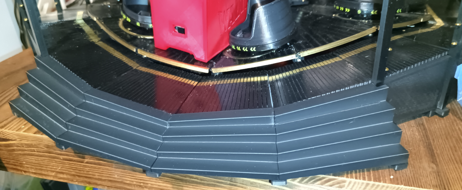 I put the walkways on the waltzer today, they were stable and im happy with the fit, but, im hot gluing them in place, the reason being, im moving the waltzer around a lot, and altho stable, they will fall off and it will annoy me.