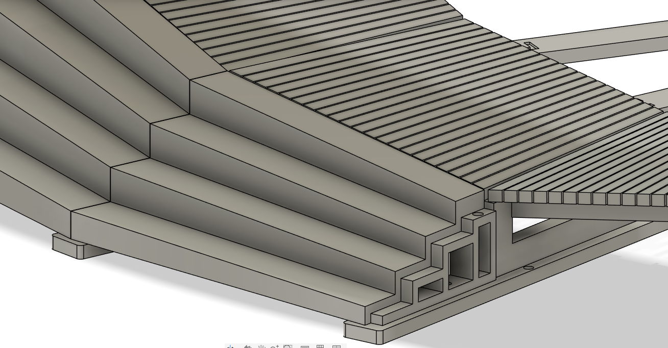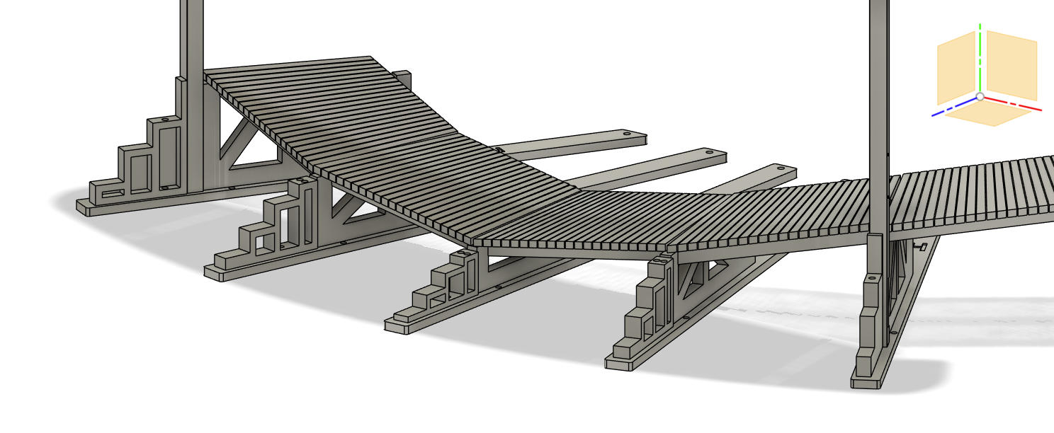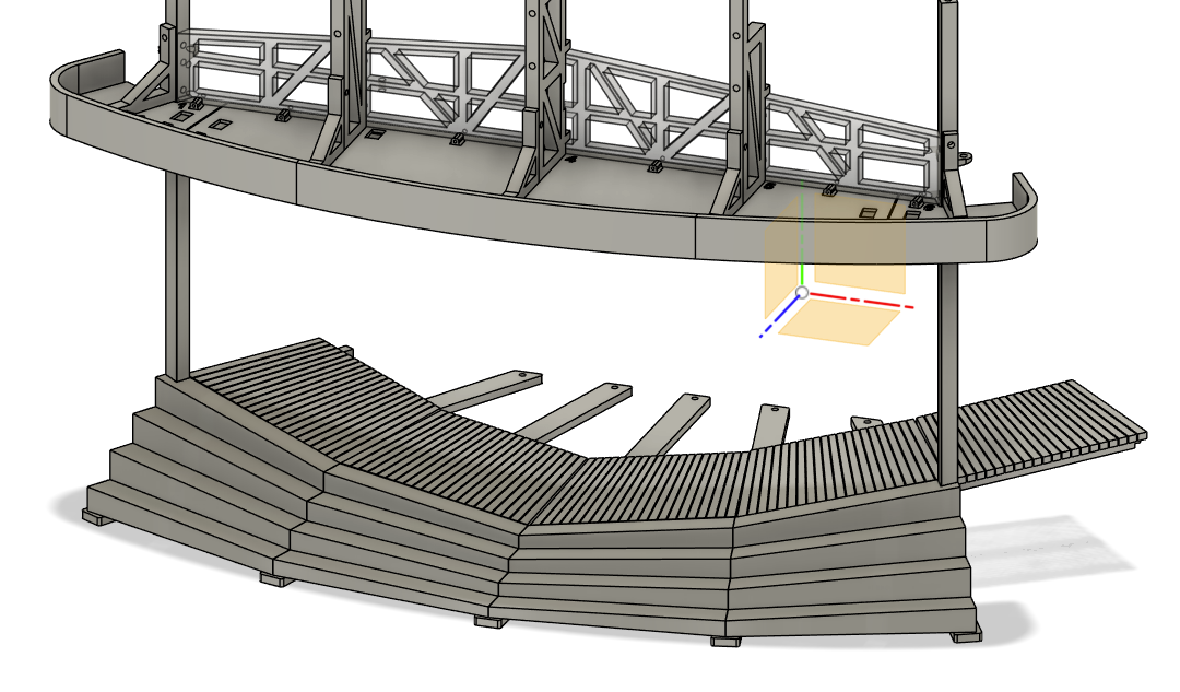 Each platform has 2 hinges, they each connect to a wheel bar. When i printed the original platforms, there was a point in the track where the wheels lifted off the track. To fix that, i increased the size of the holes for the hinge pin, giving it a little more movement. I thought it would allow the platforms to move laterally enough to keep all the wheels on the track. What it appears to do, is make it super easy for the platforms to seize up / jam. Which then causes the motors to freak out and the bevel gear to be destroyed 😭