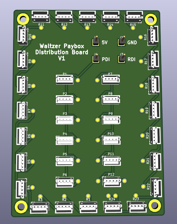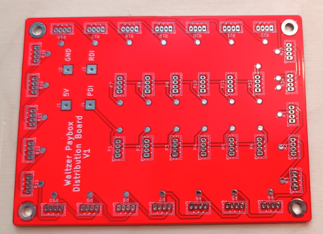 This is the distribution board PCB, The markings for the connectors are, P# for paybox, and R# for the rafters.