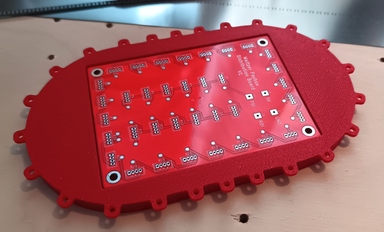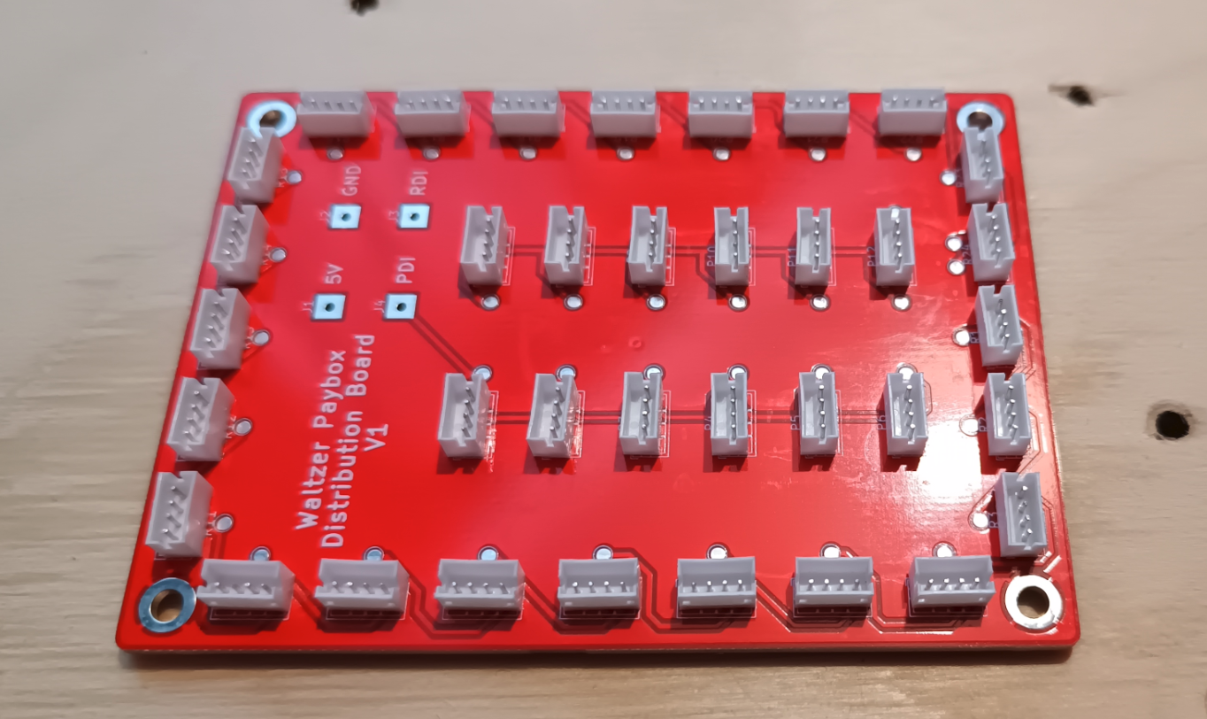 The distribution board sits recessed into the paybox roof, I was originally going to have a hole in the paybox roof for the data and power wires to go though, but i realized i could just solder them to the underside of the board.