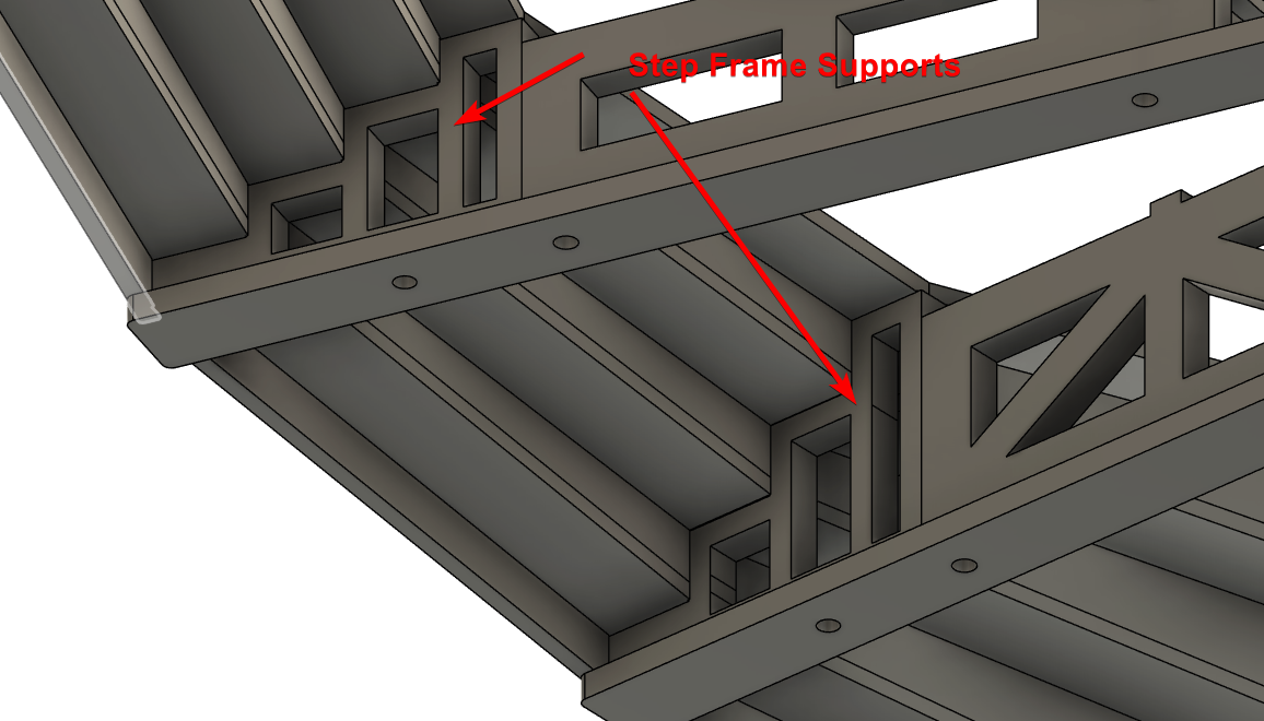 This is the underside, they have a frame support for the ends of each steps, i cant decide if i want to add something else to help prevent the steps from slipping off.