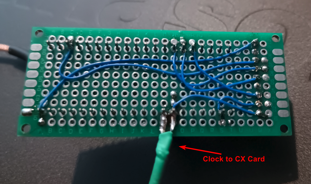 This is a fucking aweful picture, i havent worked out why my phone has such weird focus issues. Anyway, this is the back of the CX card, with the little clock board thing. They sell / give access to a real pcb, but im not ordering them and waiting for 2 weeks, so i used some double sided perf board and made my own. No idea how good it is, but its all wired according to the schematic.