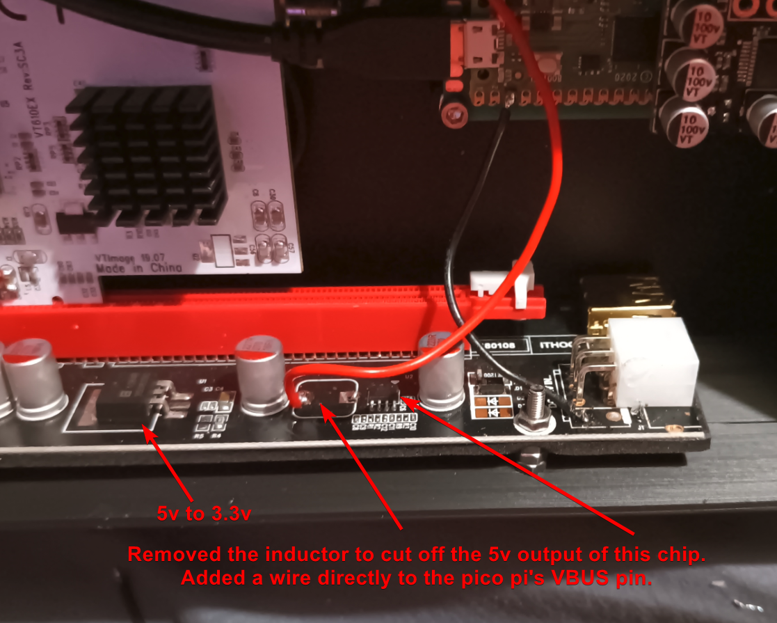 I looked though the datasheet for both the chips on the cx card to see if they use the 12v rail on the pcie connector, i also checked the 12v pins to see if they go anywhere else on the card, but i couldn't see anything. So hopefully i dont need the 12v input jack (the hole on the right side of the end of the case), as i can just use the pico pi's 5v, and the 5v to 3.3v regulator on the pcie adapter board. Ive tested it, and it seems to be working fine. Except the pico pis vbus rail is dropping to like 4.4 volts, which im not happy with.